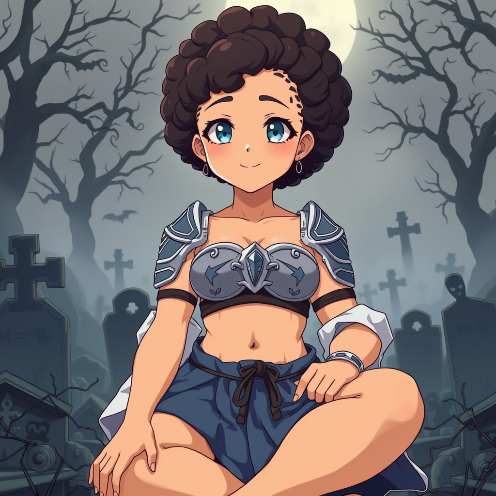 Anime full body with thick, bold outlines of a 24-year-old Walloon-Māori female girl-next-door beauty displaying a warm and inviting expression. Her light olive skin easily tans to a warm, golden hue in the summer. She wears subtle makeup, with a hint of blush and a natural pink shade on her lips. Her eyes are infinity-shaped, radiant pale blue, framed by long, elegant eyelashes. She has a curly afro and neatly shaped eyebrows that complement her delicate facial features. Her body features firm, muscular shoulders with a rounded, female bodybuilding style. She dons mermaid-themed armor with a midriff and samurai battle hakama, sitting on her knees with an eerie, fog-covered graveyard and haunting spirits in the background, styled in an unknown Masashi Kishimoto aesthetic.