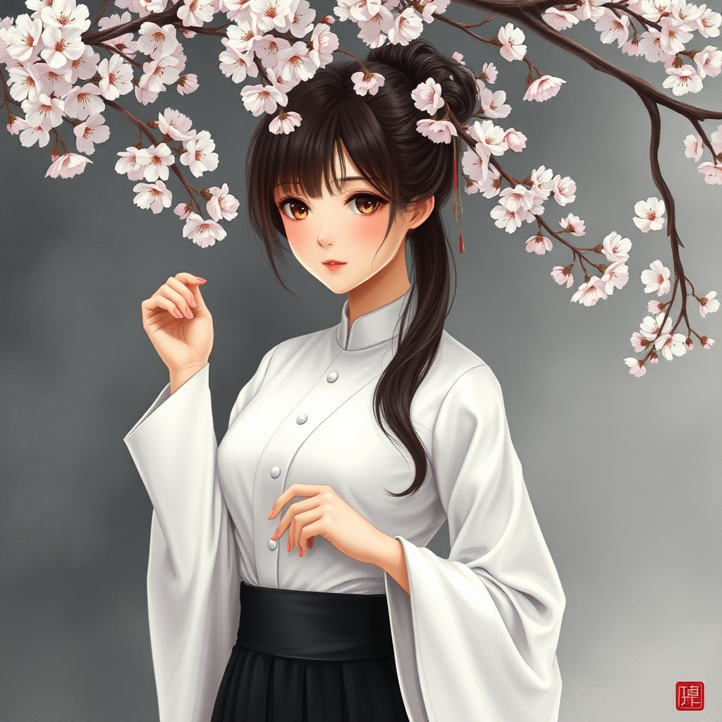 Anime girl adorned in an elegant white ensemble, gracefully holding a Japanese shirt while pairing it with a sleek black skirt, crafted in the style of an exquisite traditional Chinese painting. The scene unfolds in a romantic fantasy realm, with the aesthetics reminiscent of classical oil paintings. The palette is rich in dark bronze and subtle gray, accented by delicate cherry blossoms gently cascading around serene faces. The composition employs photo-realistic techniques, capturing intricate details in a harmonious interplay of light and shadow.