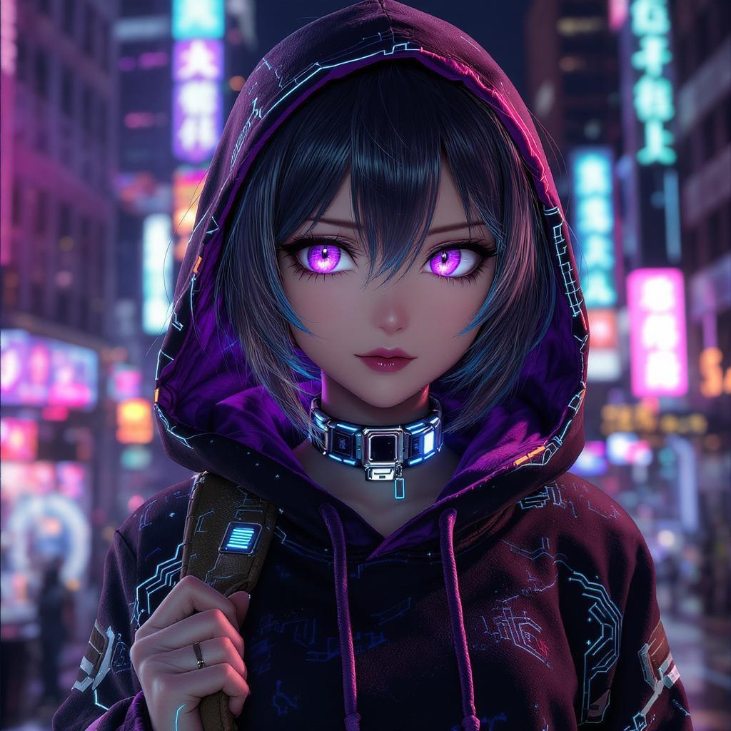 View this AI-generated image featuring a photorealistic anime girl with a sleek cyberpunk aesthetic wearing a distinctive hoodie and a stylish choker set in a vibrant metropolis her striking eyes and subtle expression capture a sense of mystery and allure reflecting the influence of guweiz s art sty