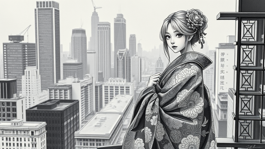 Anime girl depicted on paper, inspired by the intricate artistry of Kerem Beyit, wearing an elaborate and ornate kimono. She stands against a backdrop of cityscapes, reminiscent of John Blanche’s city portraits, showcasing a world in monochromatic depth. The image embraces realistic hyper-detail, influenced by Zhang Jingna's style, capturing each fold and pattern of the kimono. The scene is infused with a subtle yet impactful creativity, enhancing the overall composition while preserving its core essence.