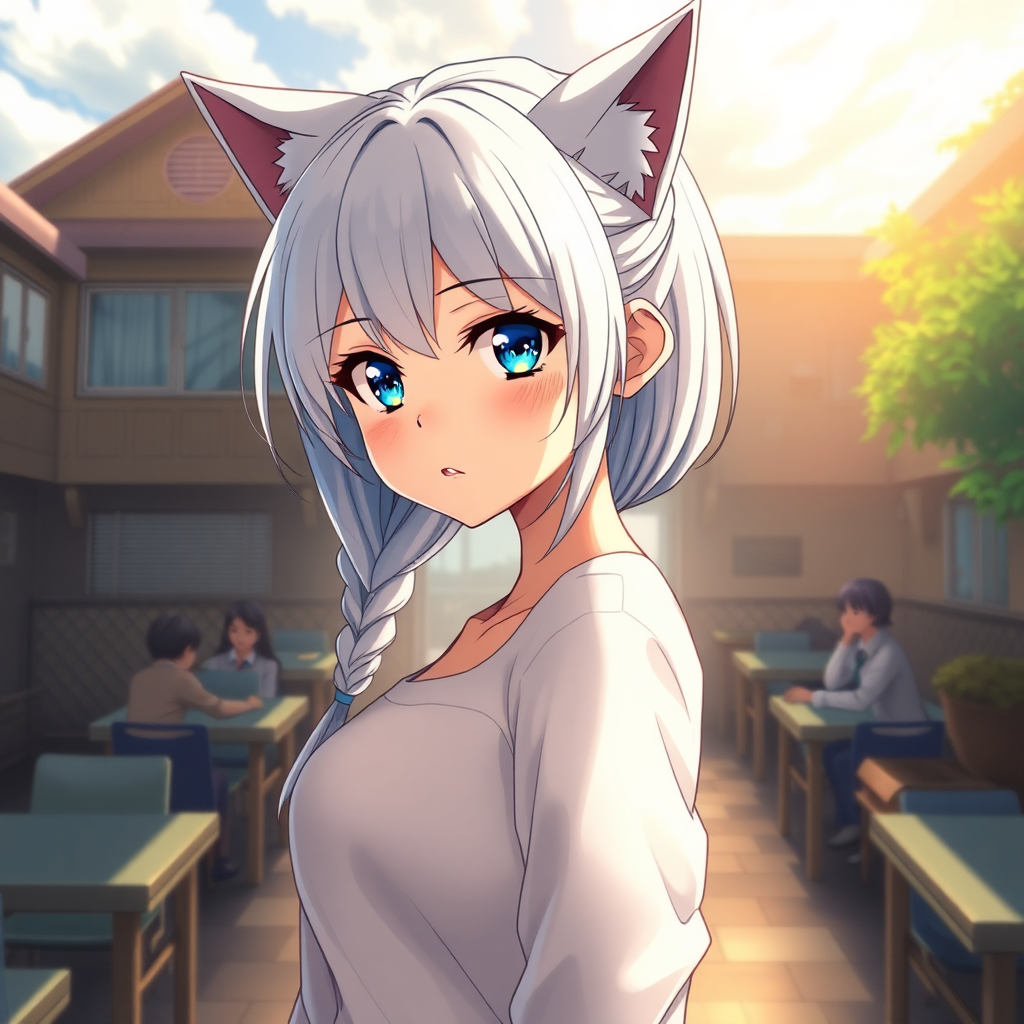 Anime girl, full body, young adult with medium chest, intricate school background; school setting, detailed medium white hair in a braid, cat ears, captivating eyes, blue, side view from waist, rich lineart, anxious expression, natural light, reflective details, volumetric lighting, high-resolution illustration, vibrant color palette, panoramic feel, masterfully crafted, stunning detail, expressive, hypermaximalist, vintage charm, anime and fantasy art fusion, vivid colors, glowing effects, hand-drawn look, cinema-quality render, sharp focus, dramatic lighting, professional oil painting inspired by Studio Ghibli, Jeremy Mann, trending on ArtStation, trending on CGSociety, intricate details, cinematic, photorealistic painting art, vivid colors, modelshoot style, majestic, by Ed Blinkey, Atey Ghailan, Greg Manchess, and Antonio Moro.