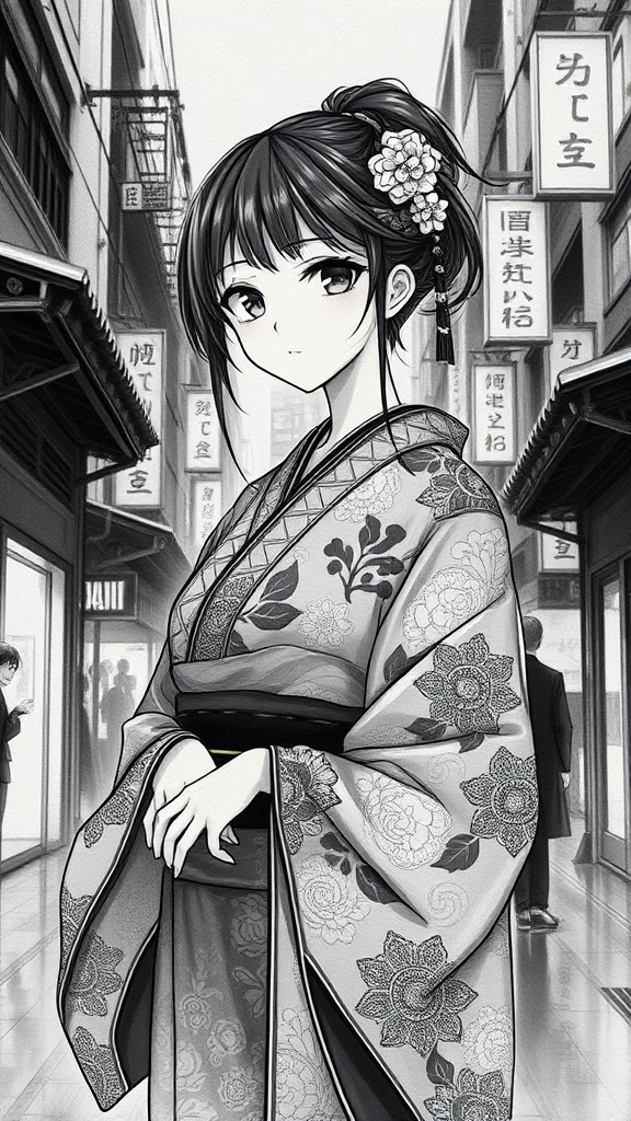 Anime girl illustration on paper, inspired by Kerem Beyit, wearing an intricate kimono, set against a backdrop of urban scenery reminiscent of John Blanche, with monochromatic depth and hyper-realistic details akin to Zhang Jingna; atmosphere imbued with a delicate interplay of shadows and highlights, capturing an ethereal yet realistic portrayal.