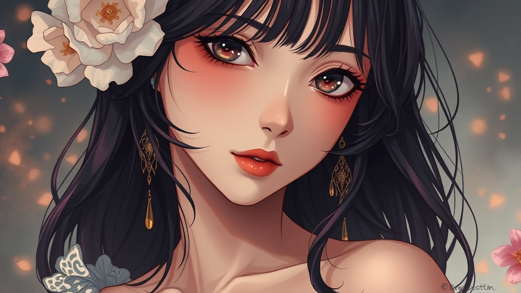 Anime girl infused with the artistic flair of Frank Thorne, embodying romanticized femininity with influences from Makoto Aida. She exudes elegance, with deeply emotive expressions captured in a close-up view. The scene unfolds with an air of stylized artistry, enhancing the delicate balance between emotion and elegance.