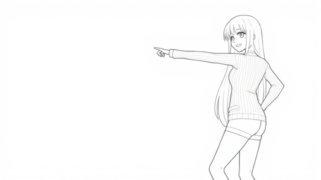 A cheerful anime girl with long hair and a ribbed sweater points to the left, looking back at the viewer with a happy smile. The monochrome line art style emphasizes her dynamic pose against a clean white background.
