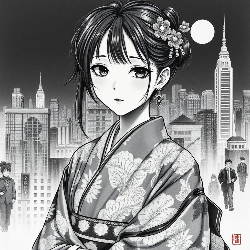 Anime girl portrait on paper, inspired by the intricate style of Kerem Beyit, dressed in an elaborate kimono, set against a backdrop of cityscapes reminiscent of John Blanche's style. Emphasize monochromatic depth with hyper-realistic detailing in the style of Zhang Jingna. Include subtle elements of urban life interwoven with traditional patterns, capturing a harmonious blend of modern and classic aesthetics.