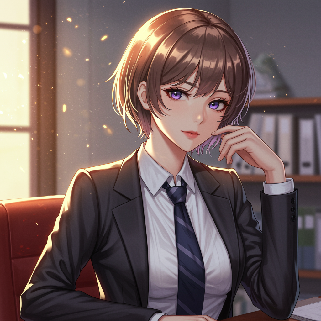 Anime heroine dressed in sophisticated office attire, rendered in a digital painting style, artstation quality, impeccable concept art, gentle lighting with hdri influence, seamlessly smooth textures, precision in focus, imaginative illustration, fantasy elements intertwined, gracefully intricate, exquisitely detailed, capturing elegance in essence.