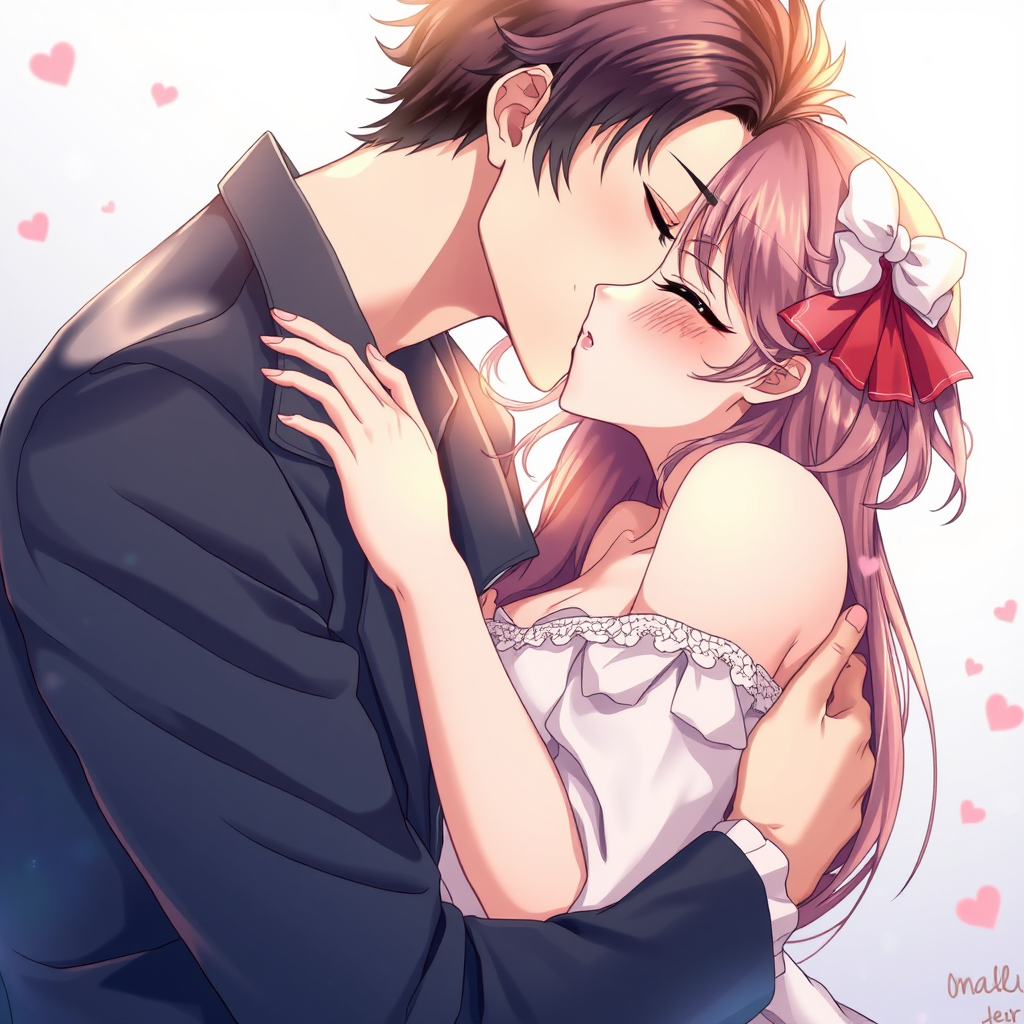 Anime illustration of an alluring boy tenderly kissing a beautiful girl, evoking the style of Yamatogawa, with hints of sensual and romantic themes. The artwork embraces vibrant and detailed visuals, capturing the essence of manga influence, with a focus on captivating expressions and intimate atmosphere. The scene conveys an emotional connection, with a refined and high-quality finish, ensuring clarity and precision in every detail. The composition maintains elegance and allure, avoiding any distracting elements or imperfections.