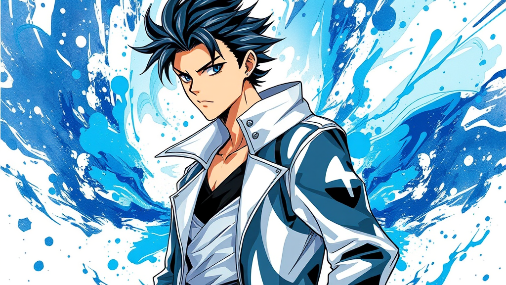 Anime illustration poster featuring a striking male character dressed in a stylish blend of black, white, and blue attire, designed with Yoh Nagao's signature dynamic flair. The background bursts with an energetic and colorful ink splash, where swirling patterns of light blues and vibrant whites create a sense of motion and intensity. The character's expression exudes confidence and mystery, with stylized, flowing hair and a hint of rebellion in his stance. The scene is imbued with a sense of futuristic urban grit, blending traditional anime aesthetics with contemporary artistic vibrancy, capturing a unique fusion of color, form, and expression.