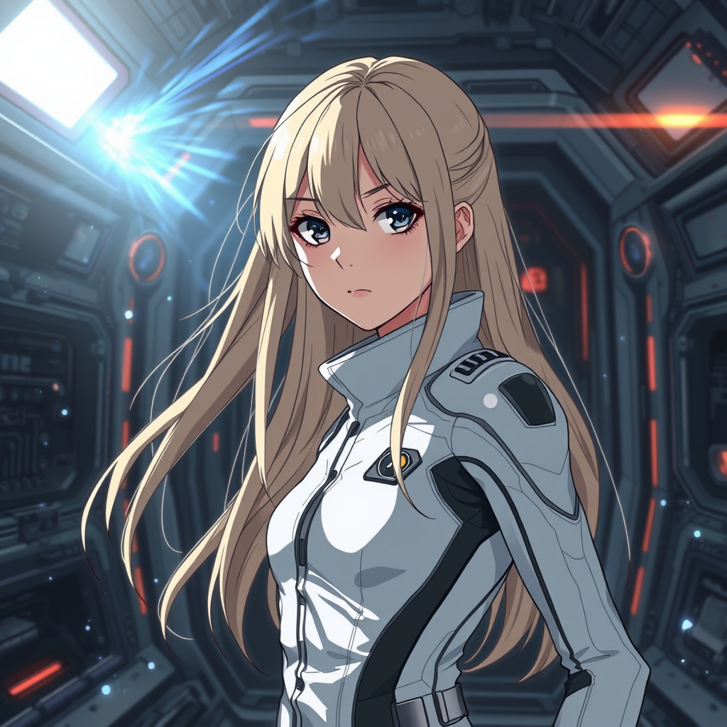 Anime-inspired art featuring a young girl in a white, form-fitting sci-fi jumpsuit, embodying a cyberpunk aesthetic. Her long, natural blonde hair flows freely, contrasting with the dramatically dark and shadowy background of a sleek, futuristic spaceship interior. She has strikingly beautiful facial features, exuding a detached, cold demeanor. The setting is a somber, chilly chamber, with finely detailed manga-style graphics. Muted colors dominate, accented by bursts of blue and contrasting bright light from one side. The environment is complex, filled with intricate elements, sharp angles, and a multi-layered architecture. Sharp shadows play against a delicately blurred backdrop, enhancing the hyper-detailed, futuristic design. A third-person perspective captures a striking portrait amid clumps of energy and flashes of light, maintaining the essence of an otherworldly sci-fi narrative.