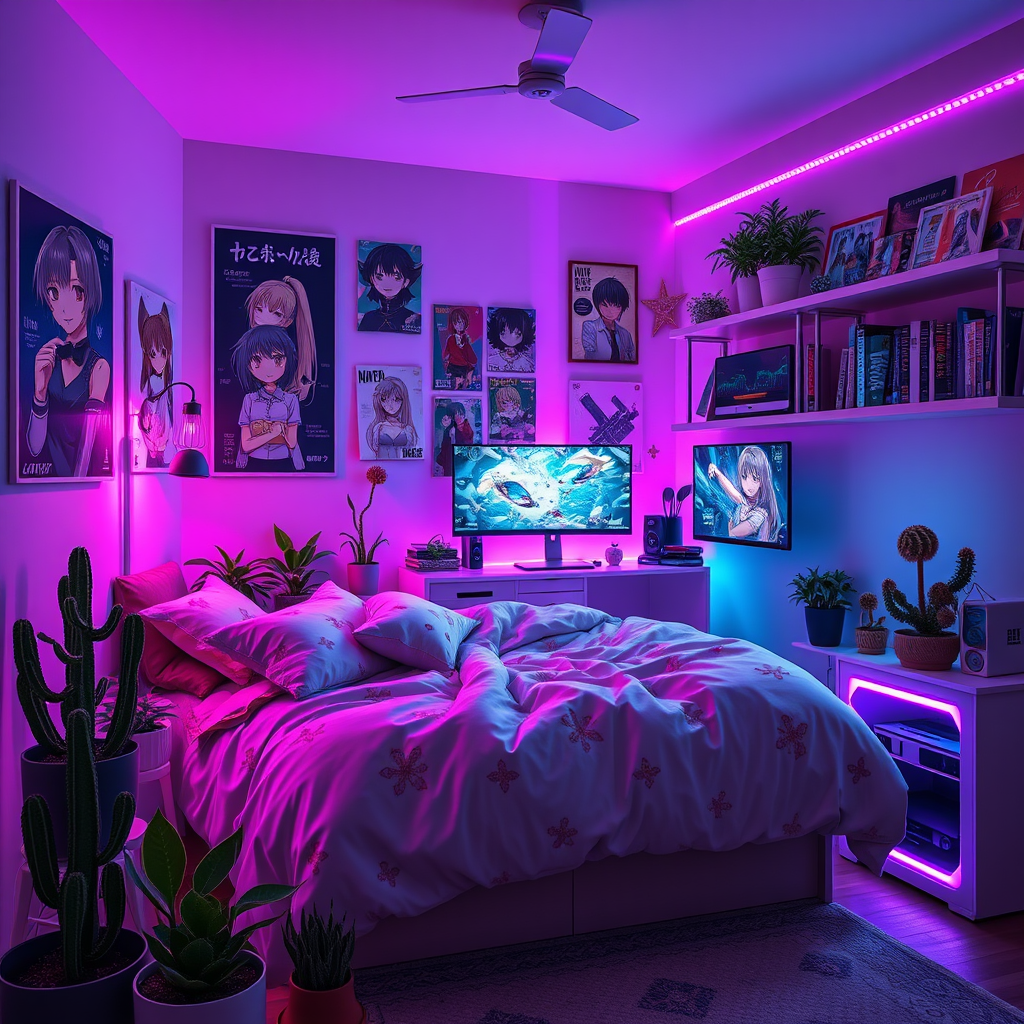Anime-inspired bedroom at night with an aesthetic vibe, filled with cute plants and cacti, illuminated by soft purple lights. The room exudes a cozy gamer otaku feel, featuring posters of beloved anime characters and a visual novel background on the computer screen that complements the room's style. A plush bed with whimsical bedding invites relaxation, while the gentle glow of LED strips highlights shelves adorned with collectibles and manga volumes.