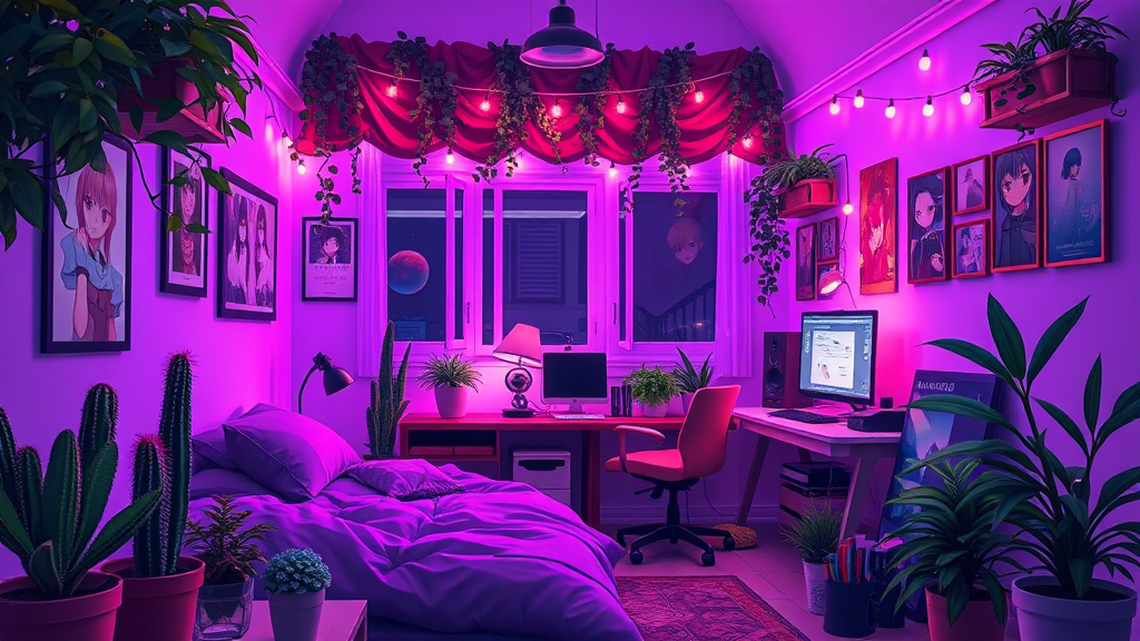 anime-inspired cozy bedroom at night featuring a playful fusion of soft purple lighting and lush greenery; cute cactus and various potted plants add charm; the space reflects an otaku gamer's haven, adorned with subtle anime posters and figurines; a computer setup ready for gaming and visual novels, with a gentle glow from fairy lights casting a warm, inviting ambiance