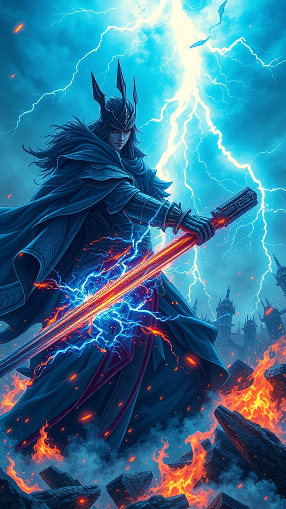 Anime-inspired digital illustration, 8K resolution, featuring a sorcerer humanoid male prince of shadows dominating a battlefield; surrounded by vibrant infernal azure flames and electric sparks against a backdrop of apocalypse. The scene is intricate and elegant, with hyper-detailed scenic visuals, showcasing a dynamic thunderstorm illuminating the battlefield with its awe-inspiring force.