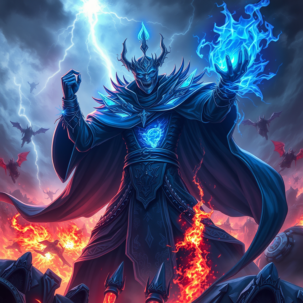 Anime-inspired digital illustration featuring a sorcerer humanoid male prince of darkness dominating a battlefield, surrounded by an apocalyptic scene. His powerful presence is accentuated by vivid blue infernal flames and sparks illuminating the chaotic background. The composition is hyper-detailed and intricately crafted, showcasing the elegance and majesty of the prince amid a thunderstorm. The colorful artwork captures the dynamic energy and intensity of the scene in stunning 8K resolution.