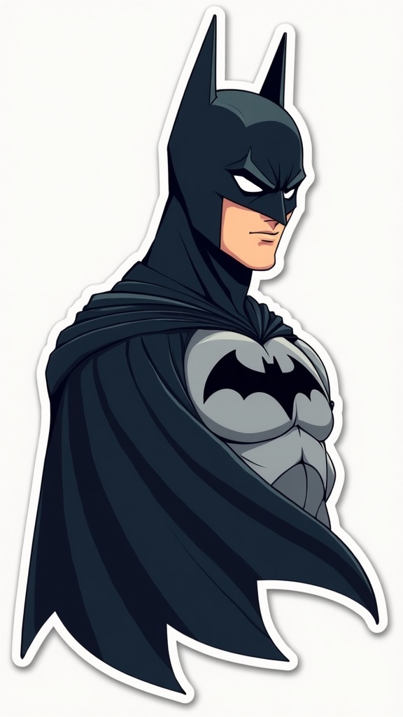 View this AI-generated image featuring a minimalist anime inspired sticker featuring batman with a subtle smirk showcasing clean lines and a sleek design capturing a modern and trendy aesthetic as seen on artstation with a vertical aspect ratio add a hint of dynamic motion with a flowing cape integr