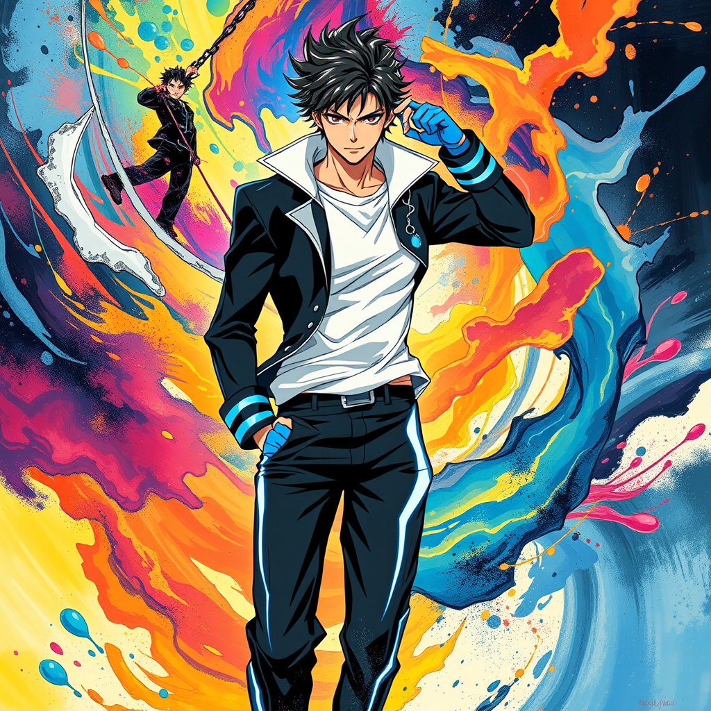 Anime poster featuring a dynamic male character donned in a striking combination of black, white, and electric blue attire, embodying a sense of energy and motion. His presence is enveloped by a swirling background of vibrant ink splashes that seem to dance with light, reminiscent of Yoh Nagao's signature style. The poster exudes a sense of adventure and intrigue, with bold lines and colors that highlight the character's determined expression and poised stance against the fluid, abstract backdrop.