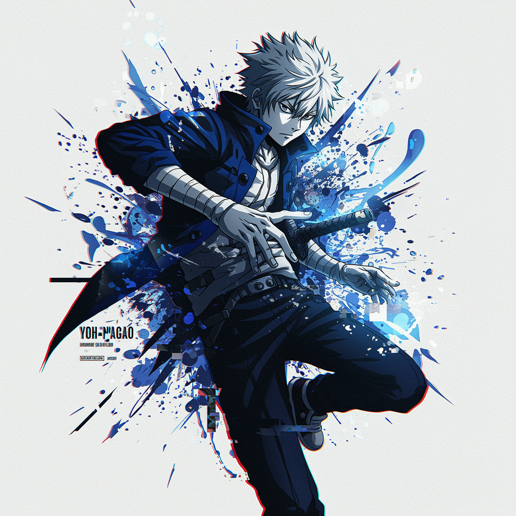 Anime poster featuring a dynamic male character dressed in a blend of monochrome and cobalt blue, inspired by the intricate style of Yoh Nagao, where an explosion of translucent, light-infused ink splashes creates an energetic backdrop, intertwined with subtle geometric patterns and a touch of digital glitch aesthetics.