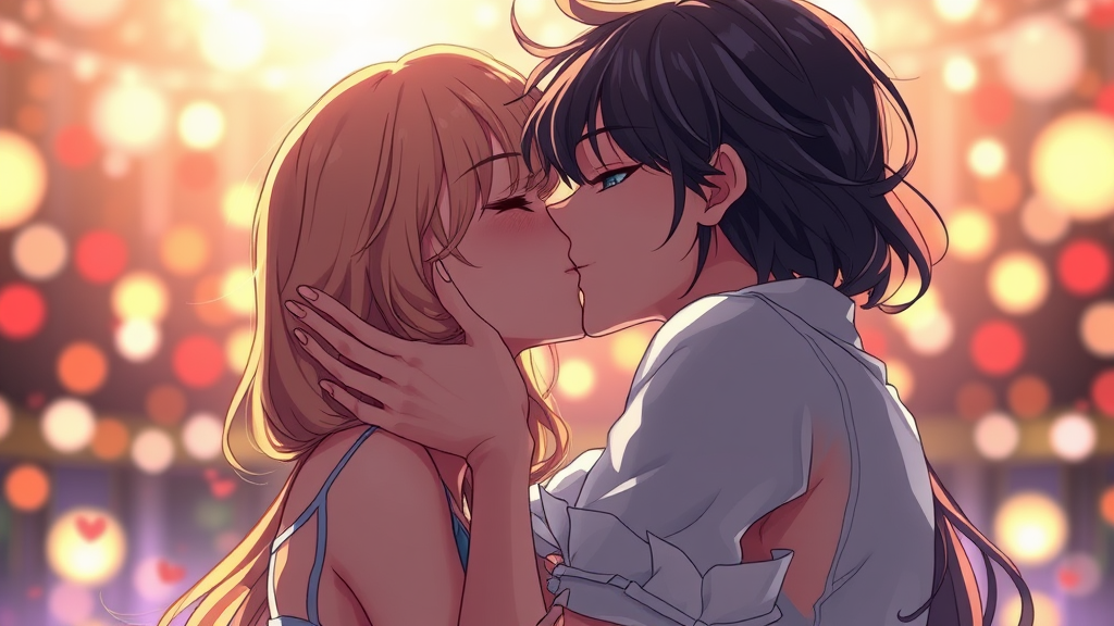 Anime romance scene, a strikingly handsome boy shares a passionate kiss with a beautiful girl, inspired by the art style of Yamatogawa, emphasizing vibrant colors and emotional intensity. The atmosphere is suggestive, with artistic nods to ero anime influences, capturing the intimate connection and allure shared between the characters. The focus remains on showcasing high-quality, detailed artwork that encapsulates the beauty and emotion of the moment, without any distracting elements or imperfections.