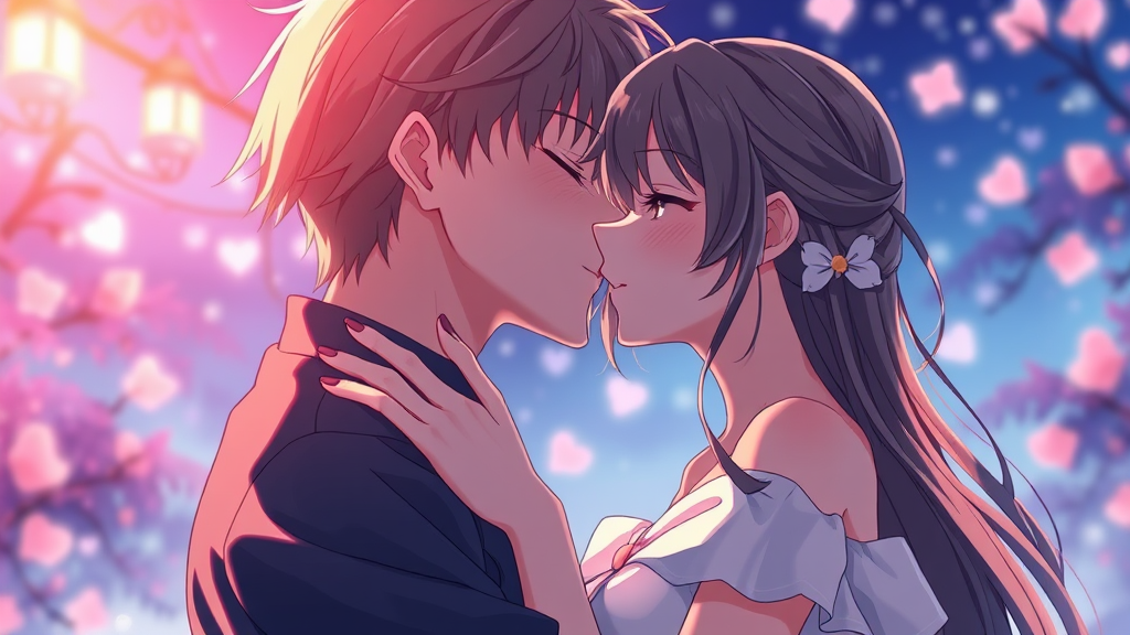 Anime scene of a handsome boy gently kissing a beautiful girl, masterpiece, romantic, intimate, inspired by erotic anime elements, detailed and vibrant in the style of Yamatogawa, without any visual distractions or low-quality features, in a tall aspect ratio.