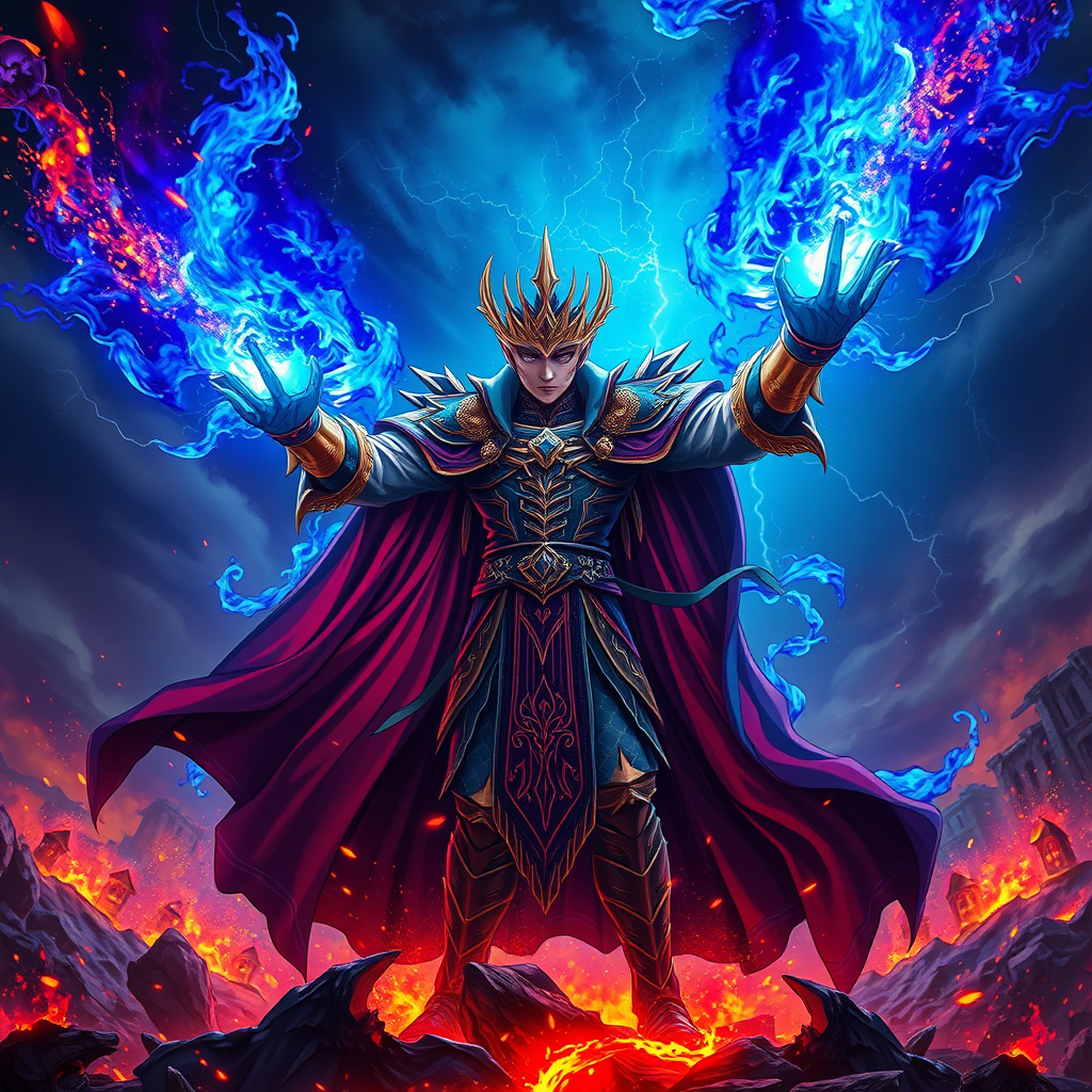 Anime sorcerer humanoid male prince of darkness triumphing on the battlefield, surrounded by vivid blue infernal flames and sparks, set against an apocalyptic backdrop. This colorful and intricate digital illustration captures the prince in an elegant, hyper-detailed style, enhanced by an 8K resolution. The scene is dramatized with a breathtaking thunderstorm, adding to the epic and scenic atmosphere of conquest.