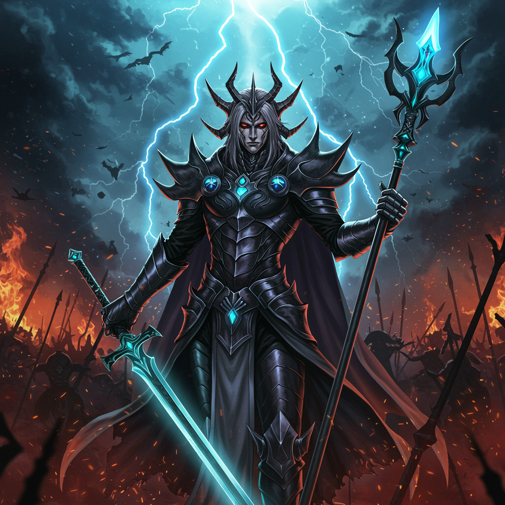 anime, ULTRA HD, SORCERER HUMANOID MALE PRINCE of shadows VICTORIOUS in battlefield, azure hellfire AND EMBERS lighting up the backgRound, ARMAGEDDON, VIBRANT, Complex, Graceful, Digital Art, Picturesque, Highly-Detailed, ULTRA HD, LIGHTNING-STORM.