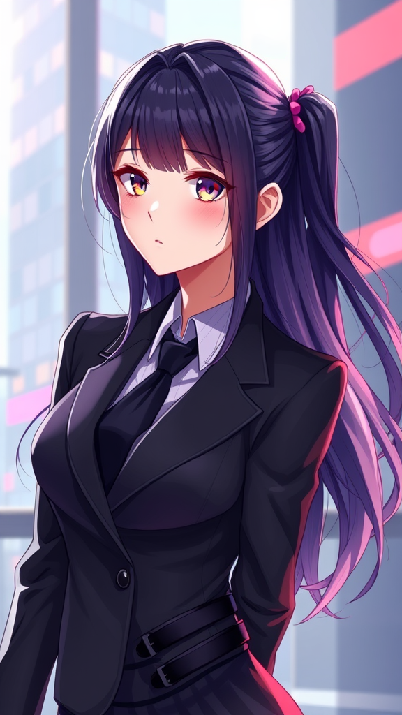 Anime waifu in sleek business attire, vibrant digital painting, inspired by ArtStation, concept art with gentle lighting, HDRI influence, refined smoothness, crystal-clear focus, illustration blending fantasy with reality, intricately designed, elegantly poised, richly detailed, captivating and modern.