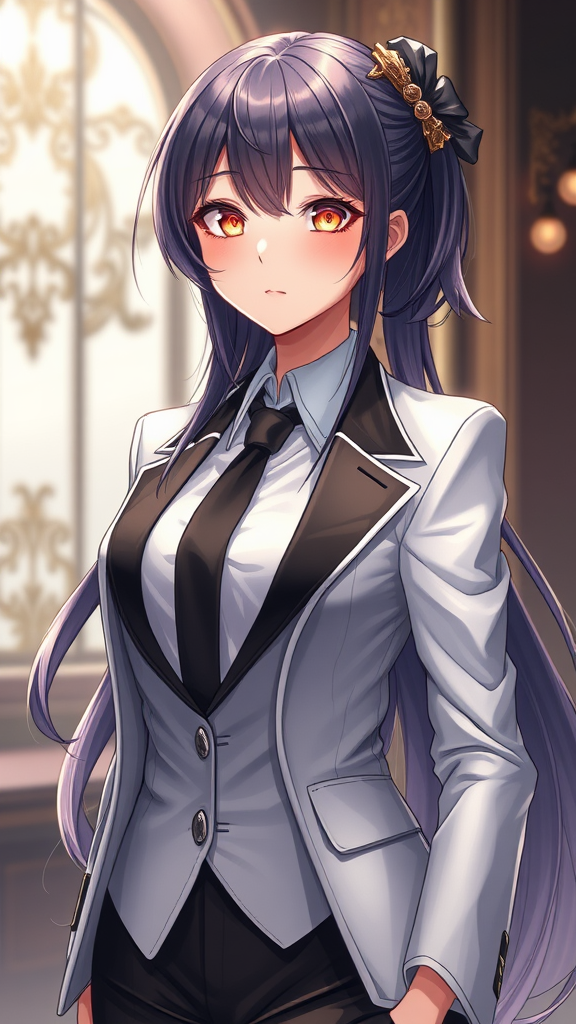 Anime waifu in sleek professional attire, digital painting, artstation style, concept art, gentle illumination, hdri effect, silky finish, crisp focus, illustration, fantasy elements, ornate, graceful, meticulously detailed, character design.