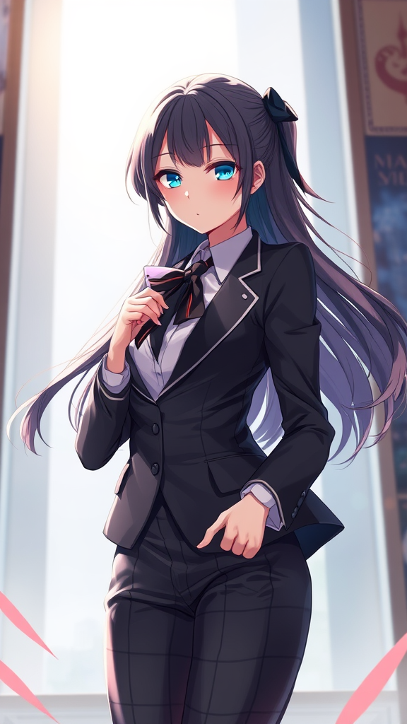 Anime waifu in sophisticated business attire, digital painting, artstation quality, concept art, gentle illumination, hdri backdrop, refined, sharp detail, vibrant illustration, fantasy-inspired, complex design, graceful, exquisitely detailed, dynamic atmosphere.