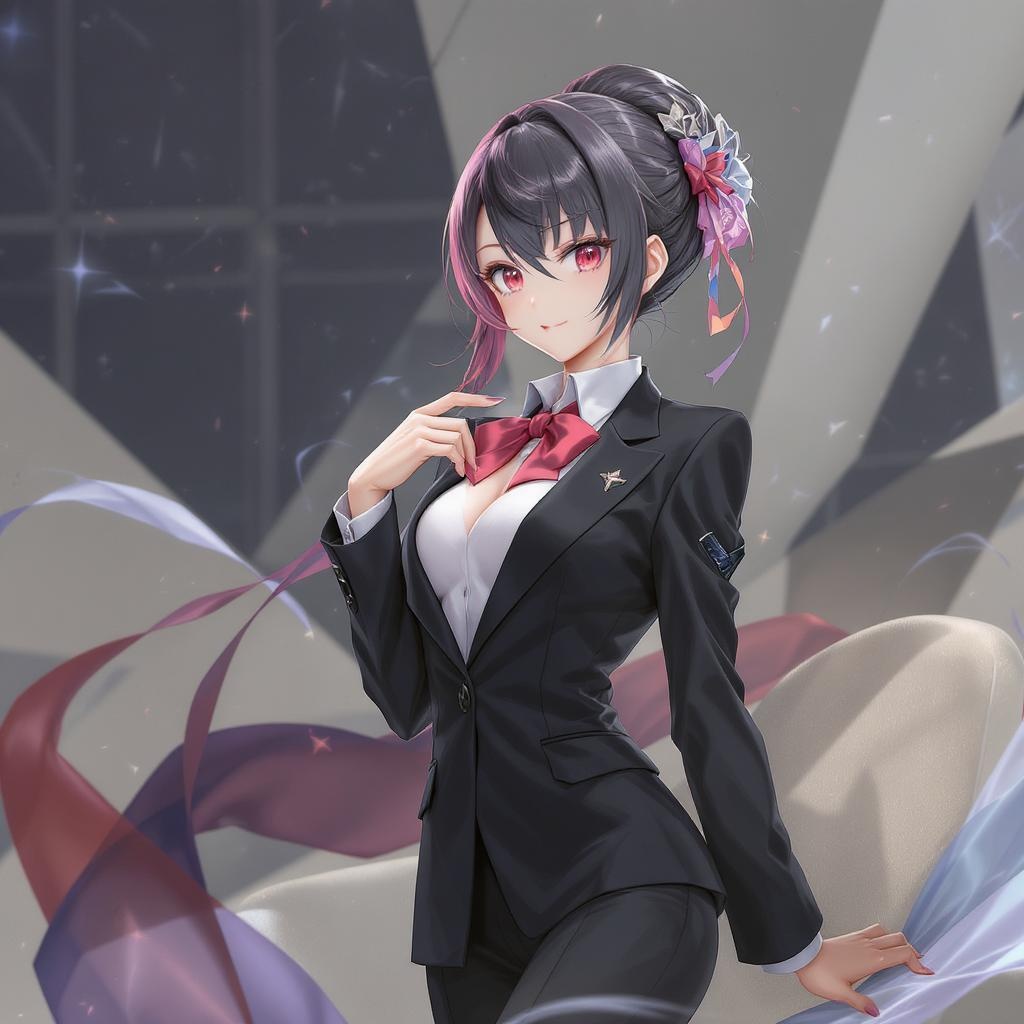 Anime waifu in sophisticated business attire, digital art, artstation-style, concept illustration, gentle illumination, hdri effects, sleek lines, crisp focus, imaginative, fantasy elements, complex design, graceful and refined, deeply detailed, dynamic composition.