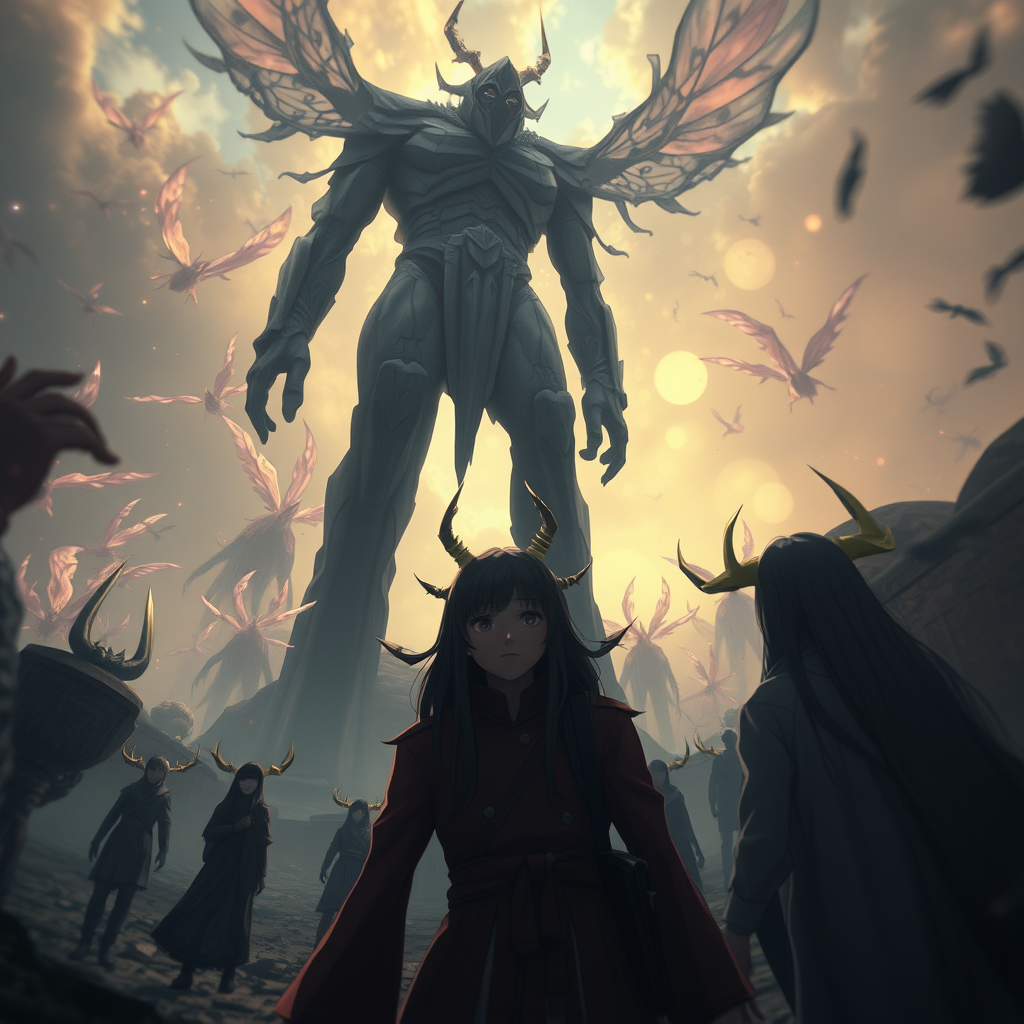 Anime world enveloped by ethereal spirits, Hayao Miyazaki-inspired atmosphere, captured in stunning 8k resolution, high definition clarity, soft contour lighting, with vivid contrasts, an immersive depth of field, ultra-detailed artistry, photorealistic elements, cinematic grandeur, sense of scale with towering figures, seen from a first-person perspective, intricate detailing, moody and shadowed tone, delicate bokeh in the background, commanding and epic composition, textures with astonishing realism, portraying an air of mystery and wonder.