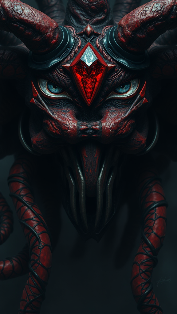 Antagonist Medusa adorned with misty gemstone eyes exuding a maddening gaze, woven into a tapestry of dark deception, painted in a style reminiscent of Greg Rutkowski, evoking horror through its cinematic flair; a masterpiece of red and black tones, gaining traction on Artstation, subtly reimagined to intensify its haunting allure.
