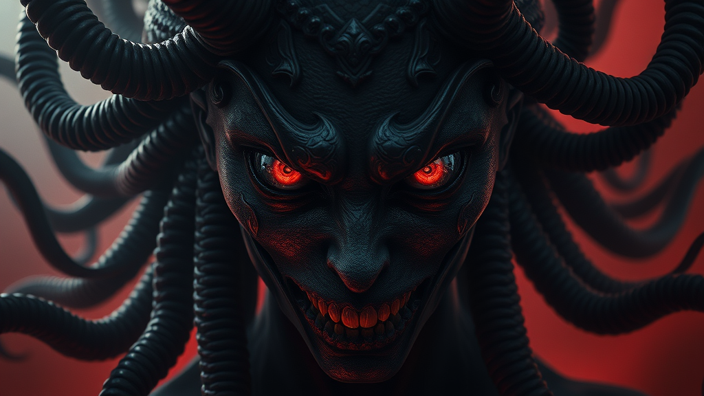 Antagonist Medusa adorned with misty gemstone eyes that cast a mesmerizing and malevolent gaze, exuding an aura of dark deception, portrayed in a cinematic and horrifying style akin to Greg Rutkowski's art. The scene is a dramatic blend of rich reds and deep blacks, embodying both a classical and trending aesthetic on Artstation, with slight creative twists that enhance the chilling and captivating nature of this mythical figure.
