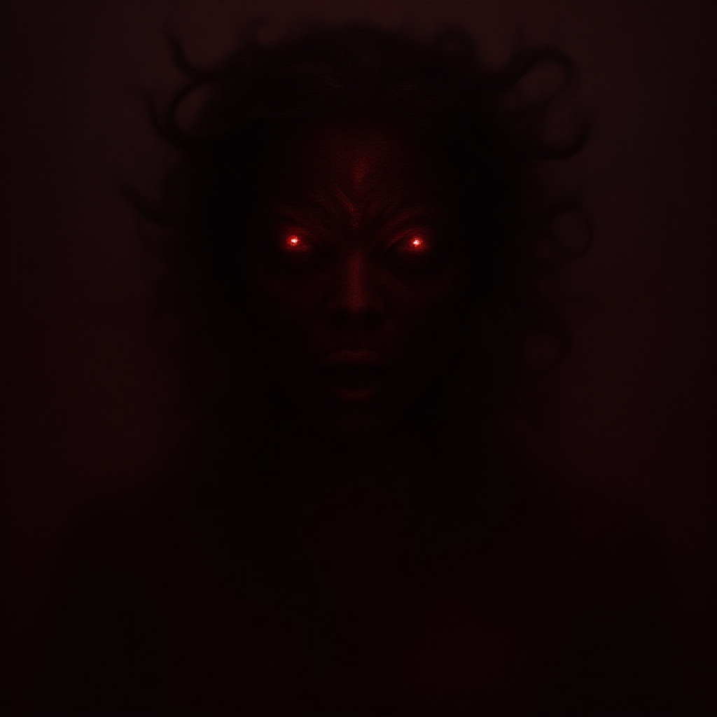 Antagonist Medusa enshrouded in a haunting mist, her eyes glittering with gem-like intensity and dark deception, portrayed in a cinematic Greg Rutkowski style. The scene is horrific yet mesmerizing, featuring an interplay of red and black hues, exuding an aura of dread and allure, trending on Artstation, with serpentine locks weaving through the atmosphere like ominous shadows.