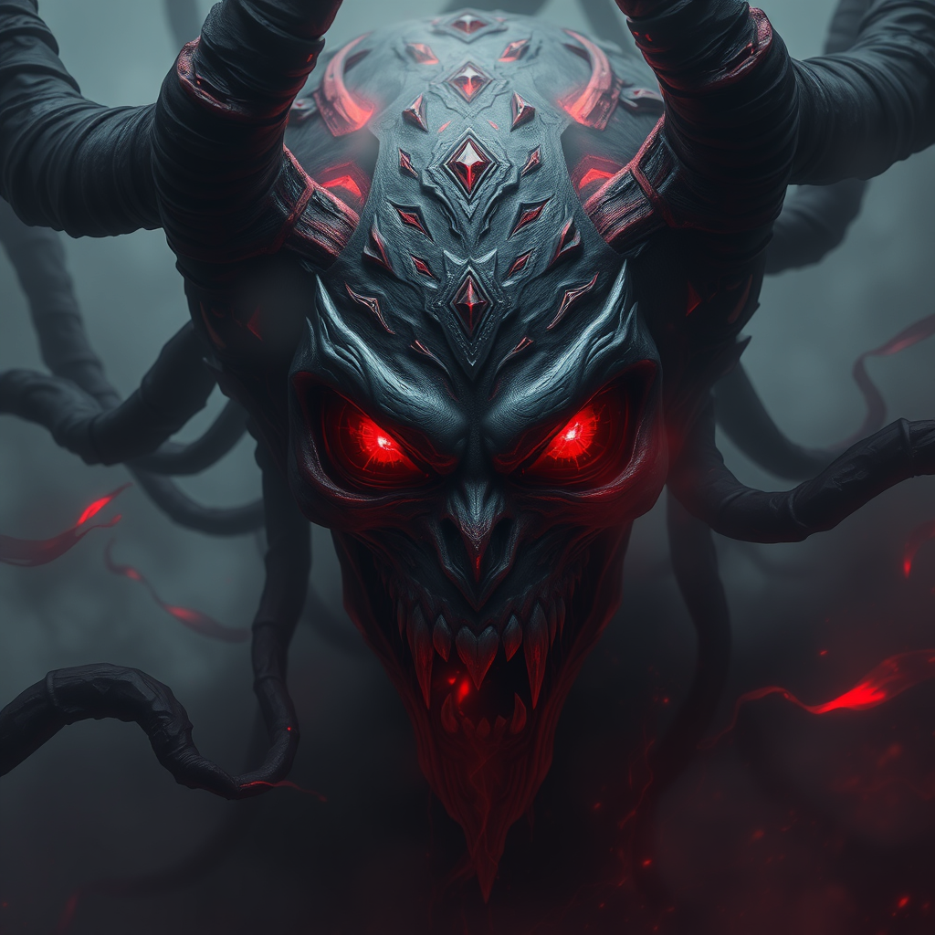 Antagonist Medusa with eyes like gems shrouded in mist, exuding a hauntingly mad gaze, weaving webs of dark deception in a cinematic Greg Rutkowski-inspired style, horrific and mesmerizing, a vision of red and black chaos, trending on ArtStation.