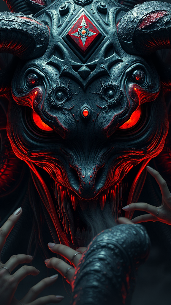 Antagonist Medusa with eyes like mist-encrusted gems, exuding a gaze filled with dark deception, depicted in a cinematic style inspired by Greg Rutkowski, horror elements intricately woven into the composition, invoking fear with a palette of vivid reds and deep blacks, unsettling yet mesmerizing in its intensity, trending on Artstation with a bold, artistic flair.