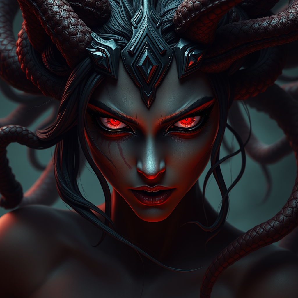 Antagonist Medusa with gemstone eyes that shimmer with a misty, maddening gaze, embodying dark deception in a vision evoking Greg Rutkowski's cinematic style, exuding horror in a palette of deep red and black, her serpentine hair twisting ominously in a scene worthy of trending on Artstation.