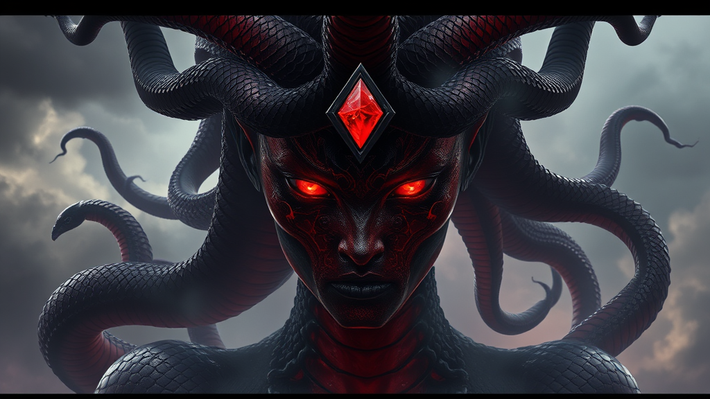 Antagonist Medusa with mist-enshrouded gem eyes that exude a maddening gaze, dark deception woven into her serpentine form, depicted in a cinematic style reminiscent of Greg Rutkowski, capturing a horrific allure, trending on Artstation with a striking palette of deep reds and blacks, set against a backdrop of stormy clouds, her scales glistening like wet obsidian, a shadowy crown of vipers writhing atop her head, exuding an aura of both danger and beauty.