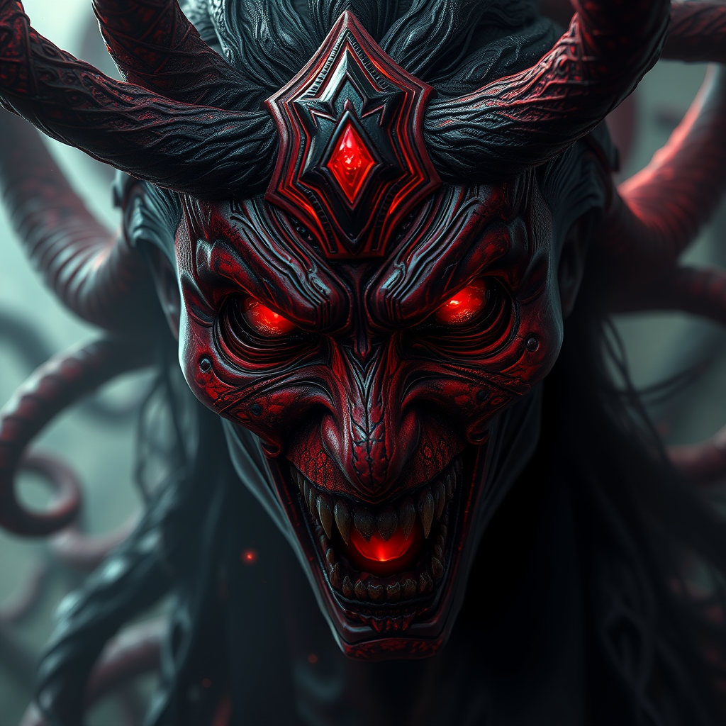 Antagonist Medusa with misty gem-like eyes that convey a maddening gaze of dark deception, rendered in a cinematic and horrific style reminiscent of Greg Rutkowski, featuring a dramatic palette of red and black, captivating and trending on Artstation.