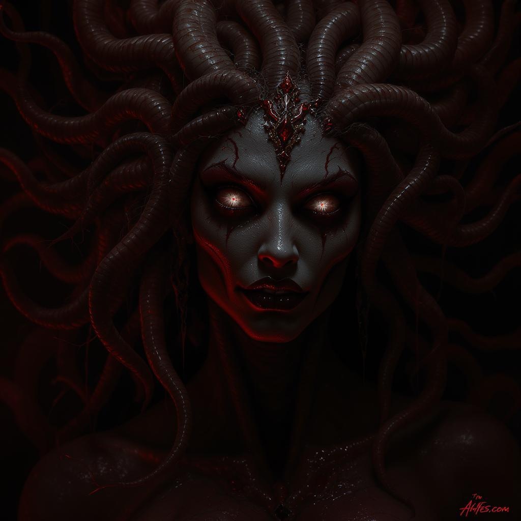 Antagonist Medusa with misty gems in her eyes, exuding dark deception, depicted in a cinematic and horrific style reminiscent of Greg Rutkowski's artistry, featuring a captivating blend of red and black tones, dynamically trending on Artstation, intertwining menace with ethereal beauty.
