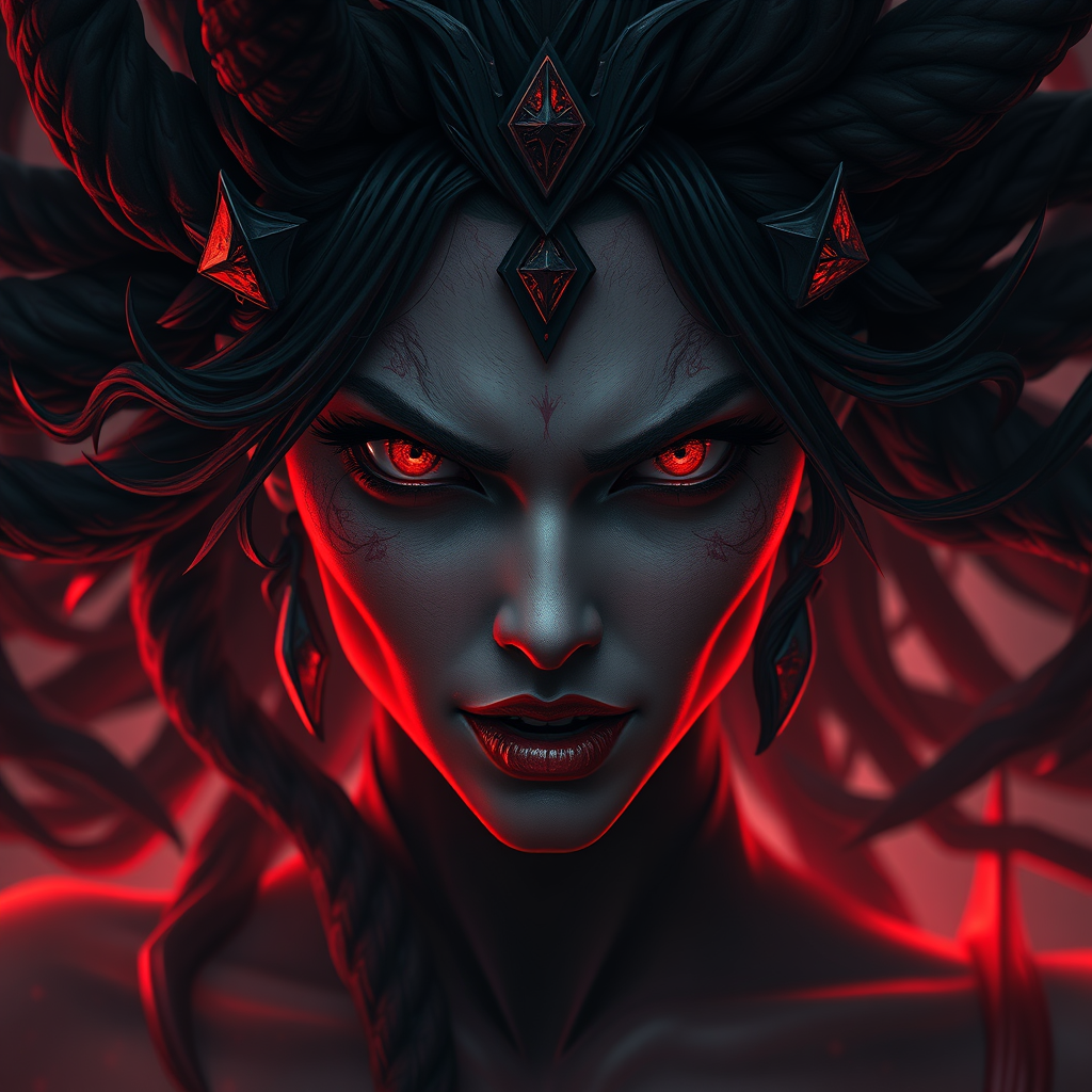 Antagonist Medusa with misty gemstone eyes exuding a mad gaze, embodying dark deception, depicted in a cinematic style reminiscent of Greg Rutkowski, striking a horrific ambiance. The color palette is dominated by rich reds and deep blacks, accentuating her fearsome presence, trending on Artstation, her serpentine hair swirling in a dance of shadows and light.