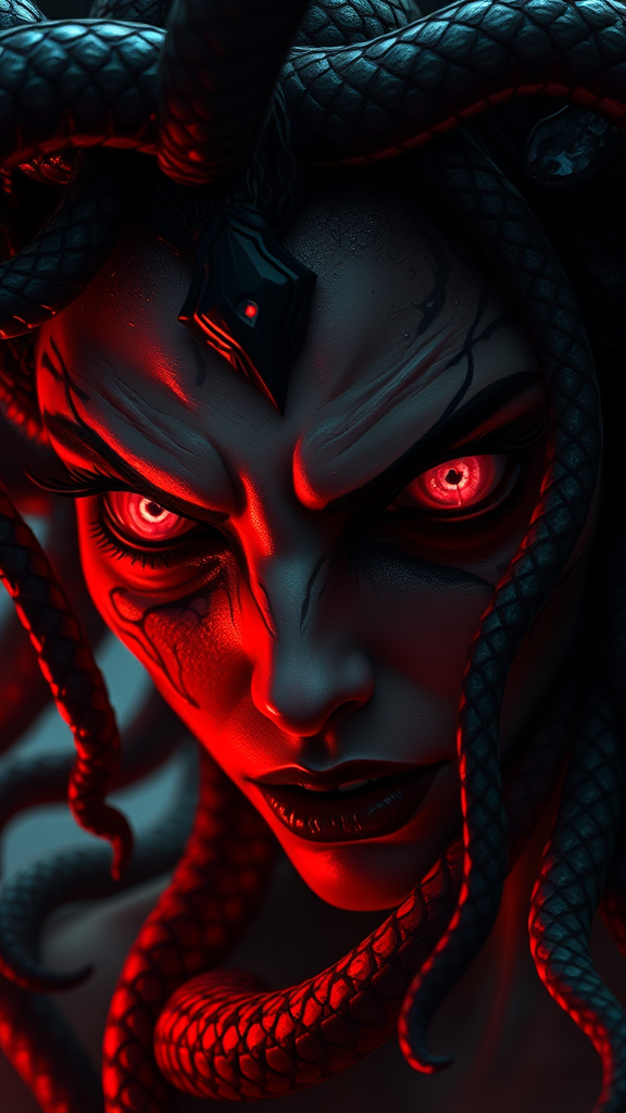 Antagonistic Medusa, her eyes gleaming with misty gemstones, exuding an aura of dark deception; the scene unfolds cinematically in a style reminiscent of Greg Rutkowski, with a horrific yet mesmerizing visage, featuring bold contrasts of deep red and shadowy black; her presence is both captivating and terrifying, as her serpentine hair twists ominously, depicted in a trending and striking composition worthy of Artstation.