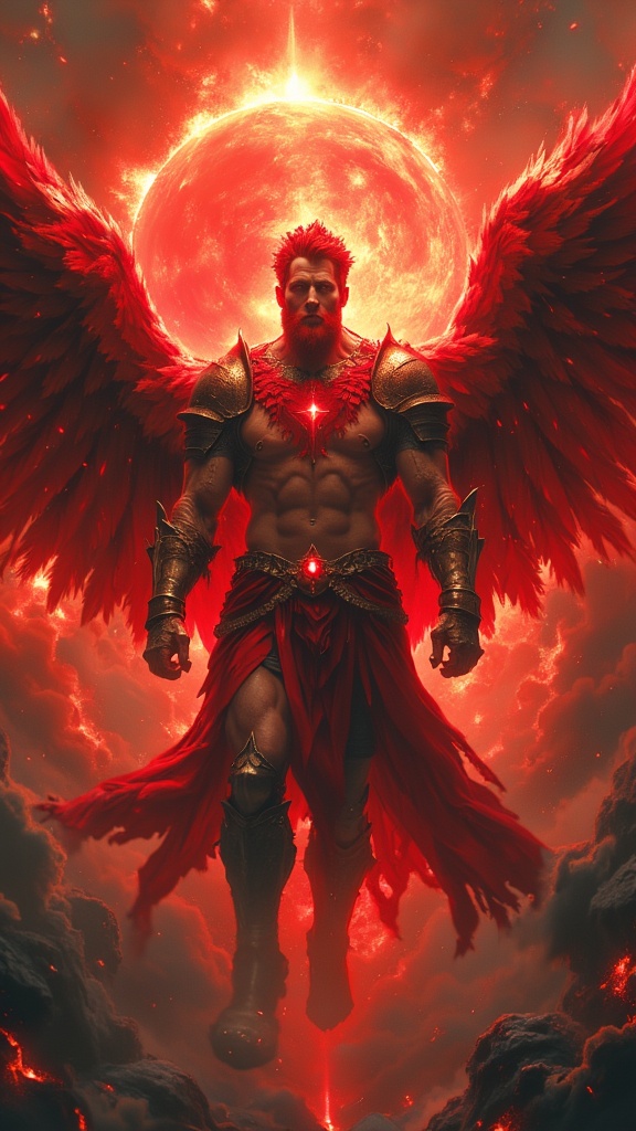 Anteres, Angel of the Red Star (red supergiant star). Celestial, powerful, warrior Angel, universal power. Tall, muscular, bodybuilder's build, big massive muscles. Caucasian male, strong brow and jaw, squared jaw, handsome masculine rugged face, sculpted cheeks. Glowing red eyes with a piercing stare. Short spiky flaming red hair fade hairstyle short on sides and back, longer on top. Short, sculpted well trimmed red Beard close to face. Bare chest, rippling muscles. Metallic red pauldrons on shoulders, metallic red bracers on arms, metallic red gladiator kilt barely covering legs. Metallic gold belt with Ruby gem center. Metallic red boots, knee-high length. Huge red feathery Angel wings ranging from scarlet to crimson, the brighter feathers on the insides and center of wings. He has a bright red aura and emits red energy, just like the star he is connected to. Full body pose, flying through space around the red supergiant star, Anteres.