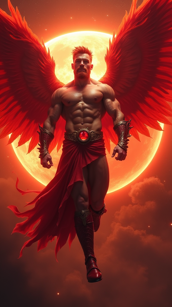 Anteres, Angel of the Red Star (red supergiant star). Celestial, powerful, warrior Angel, universal power. Tall, muscular, bodybuilder's build, big massive muscles. Caucasian male, strong brow and jaw, squared jaw, handsome masculine rugged face, sculpted cheeks. Glowing red eyes with a piercing stare. Short spiky flaming red hair fade hairstyle short on sides and back, longer on top. Short, sculpted well trimmed red Beard close to face. Bare chest, rippling muscles. Metallic red pauldrons on shoulders, metallic red bracers on arms, metallic red gladiator kilt barely covering legs. Metallic gold belt with Ruby gem center. Metallic red boots, knee-high length. Huge red feathery Angel wings ranging from scarlet to crimson, the brighter feathers on the insides and center of wings. He has a bright red aura and emits red energy, just like the star he is connected to. Full body pose, flying through space around the red supergiant star, Anteres.
