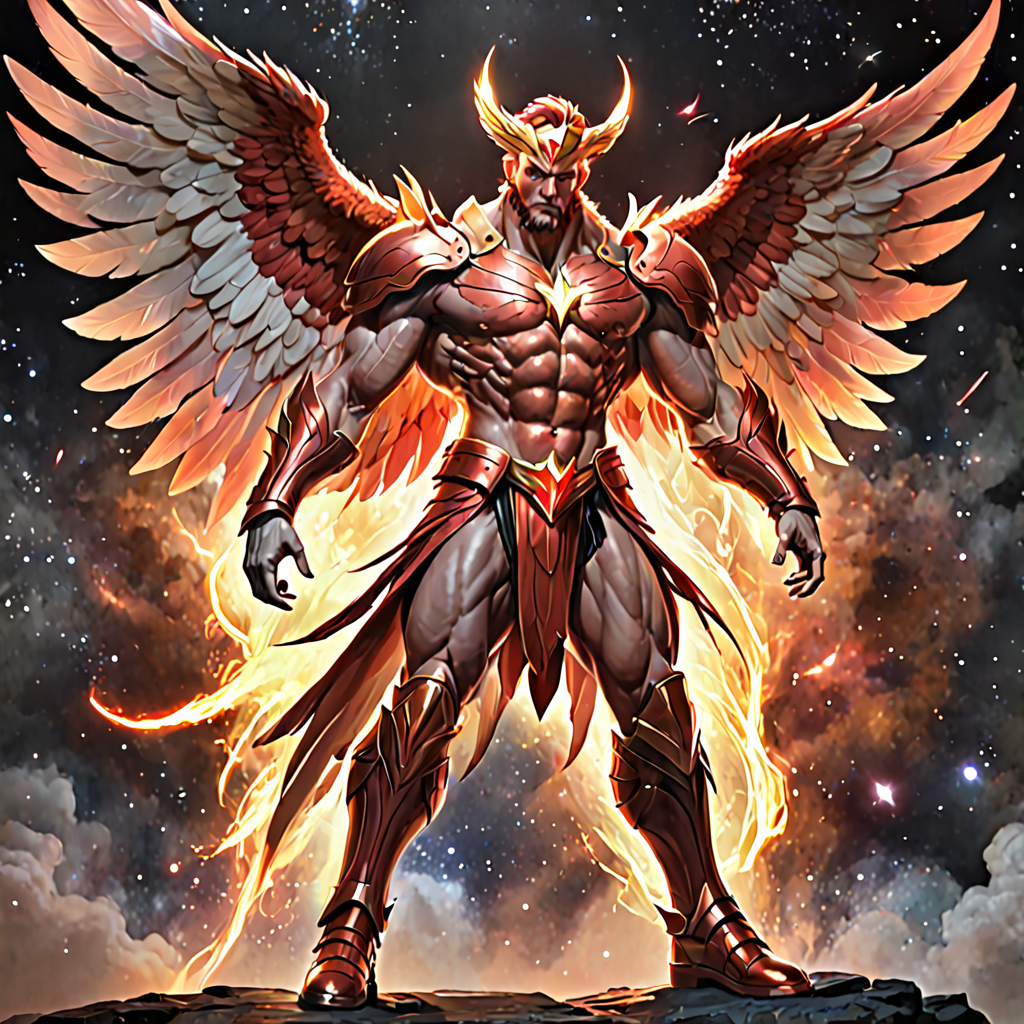 Anteres, Angel of the Red Star (red supergiant star). Celestial, powerful, warrior Angel, universal power. Tall, muscular, bodybuilder's build, big massive muscles. Caucasian male, strong brow and jaw, squared jaw, handsome masculine rugged face, sculpted cheeks. Glowing red eyes with a piercing stare. Short spiky flaming red hair fade hairstyle short on sides and back, longer on top. Short, sculpted well trimmed red Beard close to face. Bare chest, rippling muscles. Metallic red pauldrons on shoulders, metallic red bracers on arms, metallic red gladiator kilt barely covering legs. Metallic gold belt with Ruby gem center. Metallic red boots, knee-high length. Huge red feathery Angel wings ranging from scarlet to crimson, the brighter feathers on the insides and center of wings. He has a bright red aura and emits red energy, just like the star he is connected to. Full body pose, flying through space around the red supergiant star, Anteres.