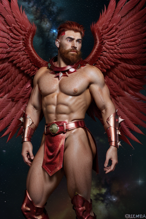 Anteres, Angel of the Red Star (red supergiant star). Celestial, powerful, warrior Angel, universal power. Tall, muscular, bodybuilder's build, big massive muscles. Caucasian male, strong brow and jaw, squared jaw, handsome masculine rugged face, sculpted cheeks. Glowing red eyes with a piercing stare. Short spiky flaming red hair fade hairstyle short on sides and back, longer on top. Short, sculpted well trimmed red Beard close to face. Bare chest, rippling muscles. Metallic red pauldrons on shoulders, metallic red bracers on arms, metallic red gladiator kilt barely covering legs. Metallic gold belt with Ruby gem center. Metallic red boots, knee-high length. Huge red feathery Angel wings ranging from scarlet to crimson, the brighter feathers on the insides and center of wings. He has a bright red aura and emits red energy, just like the star he is connected to. Full body pose, flying through space around the red supergiant star, Anteres.