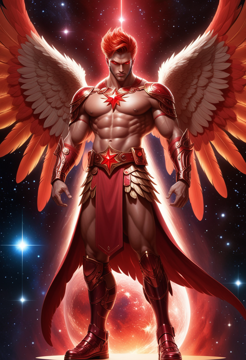 Anteres, Angel of the Red Star (red supergiant star). Celestial, powerful, warrior Angel, universal power. Tall, muscular, bodybuilder's build, big massive muscles. Caucasian male, strong brow and jaw, squared jaw, handsome masculine rugged face, sculpted cheeks. Glowing red eyes with a piercing stare. Short spiky flaming red hair fade hairstyle short on sides and back, longer on top. Short, sculpted well trimmed red Beard close to face. Bare chest, rippling muscles. Metallic red pauldrons on shoulders, metallic red bracers on arms, metallic red gladiator kilt barely covering legs. Metallic gold belt with Ruby gem center. Metallic red boots, knee-high length. Huge red feathery Angel wings ranging from scarlet to crimson, the brighter feathers on the insides and center of wings. He has a bright red aura and emits red energy, just like the star he is connected to. Full body pose, flying through space around the red supergiant star, Anteres.