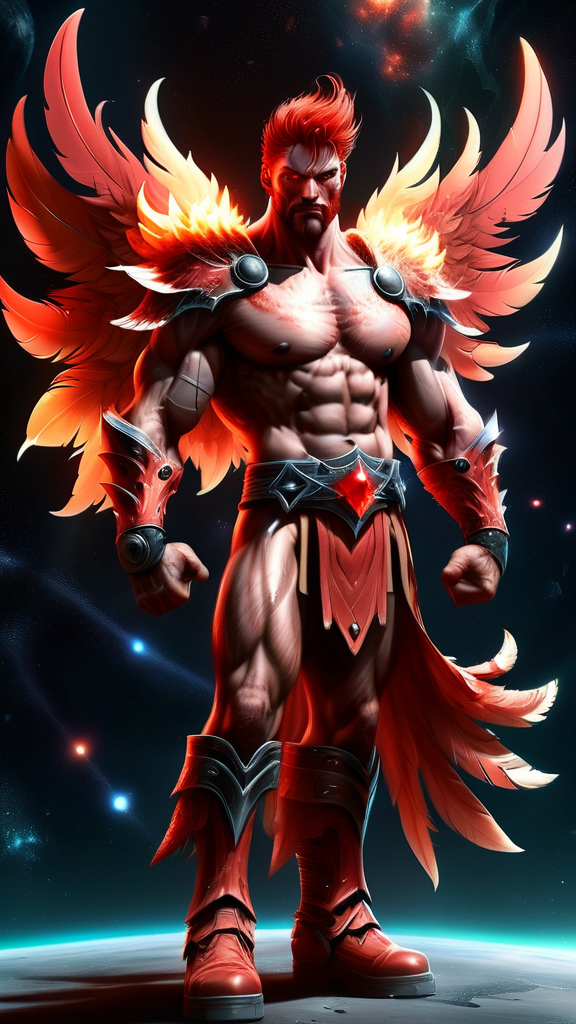 Anteres, Angel of the Red Star (red supergiant star). Celestial, powerful, warrior Angel, universal power. Tall, muscular, bodybuilder's build, big massive muscles. Caucasian male, strong brow and jaw, squared jaw, handsome masculine rugged face, sculpted cheeks. Glowing red eyes with a piercing stare. Short spiky flaming red hair fade hairstyle short on sides and back, longer on top. Short, sculpted well trimmed red Beard close to face. Bare chest, rippling muscles. Metallic red pauldrons on shoulders, metallic red bracers on arms, metallic red gladiator kilt barely covering legs. Metallic gold belt with Ruby gem center. Metallic red boots, knee-high length. Huge red feathery Angel wings ranging from scarlet to crimson, the brighter feathers on the insides and center of wings. He has a bright red aura and emits red energy, just like the star he is connected to. Full body pose, flying through space around the red supergiant star, Anteres.