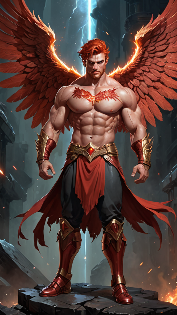 Anteres, Angel of the Red Star (red supergiant star). Celestial, powerful, warrior Angel, universal power. Tall, muscular, bodybuilder's build, big massive muscles. Caucasian male, strong brow and jaw, squared jaw, handsome masculine rugged face, sculpted cheeks. Glowing red eyes with a piercing stare. Short spiky flaming red hair fade hairstyle short on sides and back, longer on top. Short, sculpted well trimmed red Beard close to face. Bare chest, rippling muscles. Metallic red pauldrons on shoulders, metallic red bracers on arms, metallic red gladiator kilt barely covering legs. Metallic gold belt with Ruby gem center. Metallic red boots, knee-high length. Huge red feathery Angel wings ranging from scarlet to crimson, the brighter feathers on the insides and center of wings. He has a bright red aura and emits red energy, just like the star he is connected to. Full body pose, flying through space around the red supergiant star, Anteres.