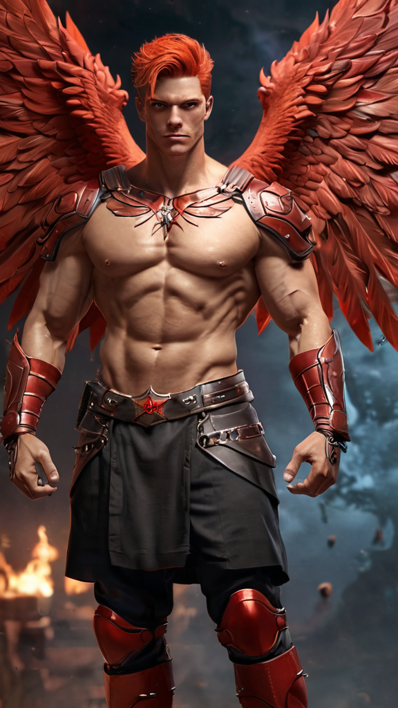 Anteres, Angel of the Red Star (red supergiant star). Celestial, powerful, warrior Angel, universal power. Tall, muscular, bodybuilder's build, big massive muscles. Caucasian male, strong brow and jaw, squared jaw, handsome masculine rugged face, sculpted cheeks. Glowing red eyes with a piercing stare. Short spiky flaming red hair fade hairstyle short on sides and back, longer on top. Short, sculpted well trimmed red Beard close to face. Bare chest, rippling muscles. Metallic red pauldrons on shoulders, metallic red bracers on arms, metallic red gladiator kilt barely covering legs. Metallic gold belt with Ruby gem center. Metallic red boots, knee-high length. Huge red feathery Angel wings ranging from scarlet to crimson, the brighter feathers on the insides and center of wings. He has a bright red aura and emits red energy, just like the star he is connected to. Full body pose, flying through space around the red supergiant star, Anteres.