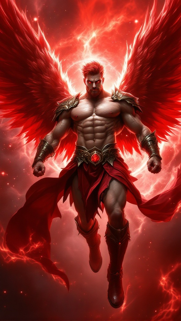 Anteres, Angel of the Red Star (red supergiant star). Celestial, powerful, warrior Angel, universal power. Tall, muscular, bodybuilder's build, big massive muscles. Caucasian male, strong brow and jaw, squared jaw, handsome masculine rugged face, sculpted cheeks. Glowing red eyes with a piercing stare. Short spiky flaming red hair fade hairstyle short on sides and back, longer on top. Short, sculpted well trimmed red Beard close to face. Bare chest, rippling muscles. Metallic red pauldrons on shoulders, metallic red bracers on arms, metallic red gladiator kilt barely covering legs. Metallic gold belt with Ruby gem center. Metallic red boots, knee-high length. Huge red feathery Angel wings ranging from scarlet to crimson, the brighter feathers on the insides and center of wings. He has a bright red aura and emits red energy, just like the star he is connected to. Full body pose, flying through space around the red supergiant star, Anteres.