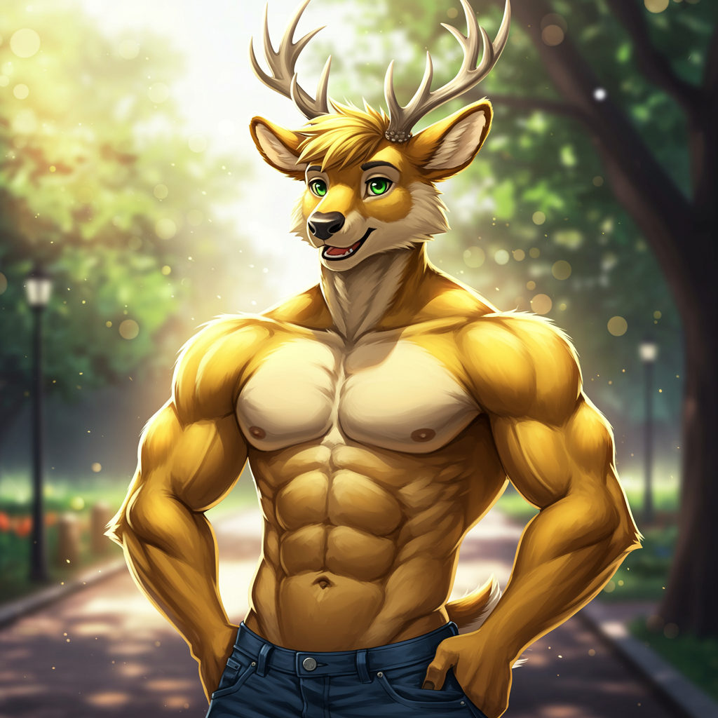 anthro furry art inspired by e621 featuring a muscular male deer with yellow fur and skin, standing in a park setting, adorned with jeans and exhibiting green eyes. The scene is bathed in a soft, luminous glow with reflections and shadows enhancing the ultra realistic and ultra detailed visual style. The deer character's fluffy fur contrasts with his muscular build, while his expression shows a smiling human-like face. Elements of bloom and shine highlight the best quality aspects of the artwork, creating an immersive visual experience.